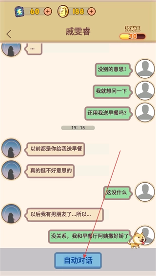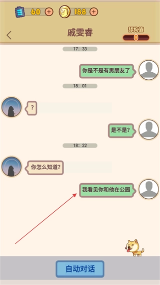 3、持续通过自动对话推进聊天流程,根据回复提升舔狗值。