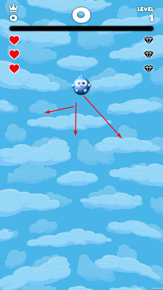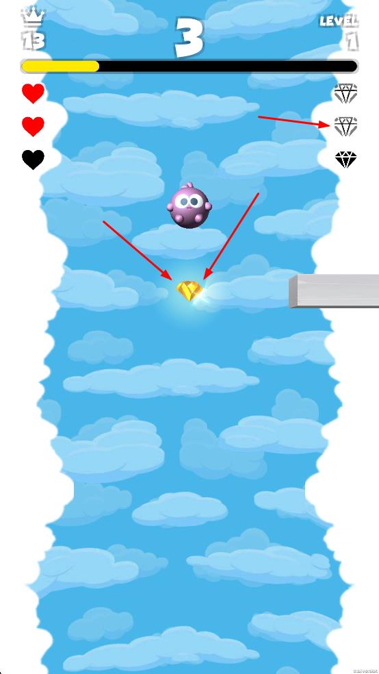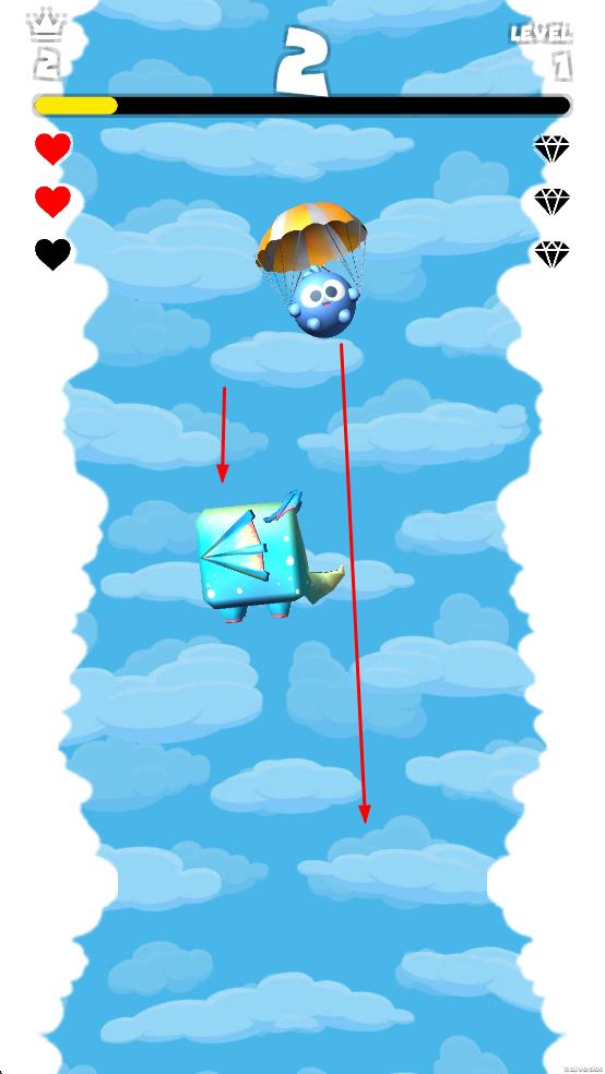 1、进入Level1关卡后,操控蓝色怪物顺着箭头所指的方向下落,注意观察左上角的爱心数量,确保能够存活下去。