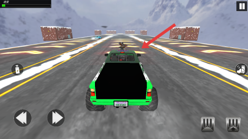1、启动绿色卡车,借助左下角方向键操控转向,右侧按键调节速度,利用赛道上的黄色加速道实现加速。