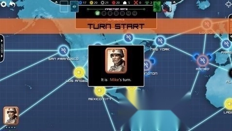 2、玩家在自己的回合结束前,将再有城市受到疾病感染,可能导致流行病蔓延。你必须致力预防疫症爆发,避免情况失控。