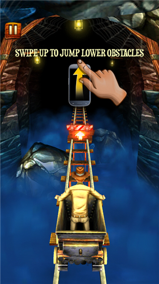 2、坐上小矿车,它在轨道上飞驰,你能坚持多长时间呢?滑动手指,让小矿车跳跃起来,去收集更多的宝藏吧。