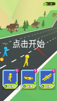 1、进入初始界面后,点击【开始】按钮进入游戏,可选择黄色角色或解锁载具,随后开启竞速环节。