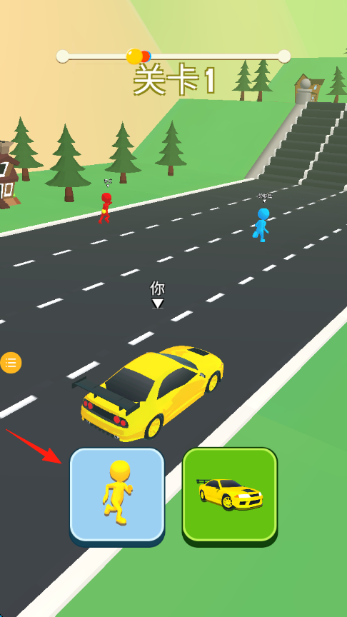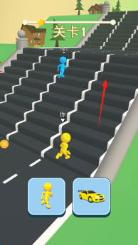 2、在关卡1里,操控黄色角色顺着箭头所指的方向【攀爬楼梯跑道】,去追赶前面的蓝色对手。