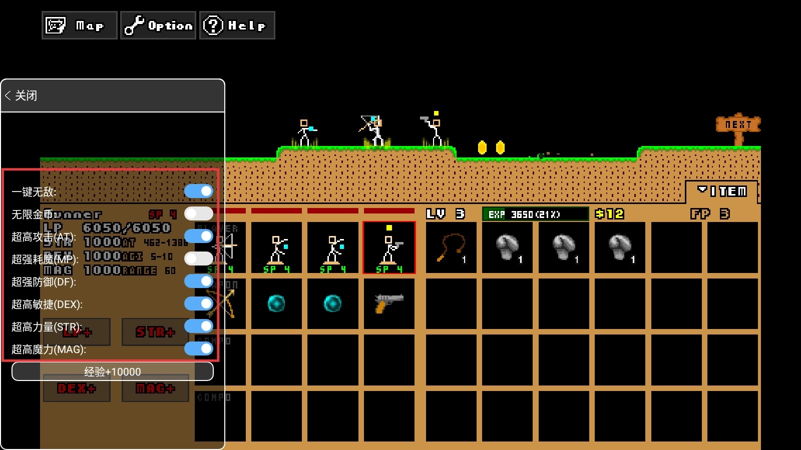 4、开启【一键无敌】等辅助功能,调整角色属性提升战力,轻松应对困难关卡,畅享冒险体验。