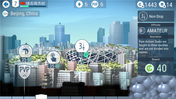 2、若在规定时间内没能击打到有效部位,则双方互换攻防位置,直到一方得分为止。快速对决(Quick Duel) 模式为双方在规定的时间内,最先击中对方达有效次数,或时间到后击中对方次数多者为胜。一击致胜(One Touch)模式为率先攻击到对方有效部位则获得胜利。也有影子对决(Shadow Duel)模式,该模式类似音游的玩法,要求玩家按提示顺序进行攻防,并且在20秒内犯错的次数不能超过5次,攻防的频率会随时间的推移增加。当玩家在地区赛事完成度达到100%时,就能参加全国冠军赛,冠军赛采用常规对决,获胜之后即可飞往下一个国家进行比赛。