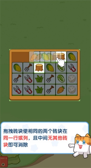 2、还可以拖动物品,让相同的两个物品处于同一行或同一列,并且它们之间没有其他物品阻隔,这样就能完成消除操作。