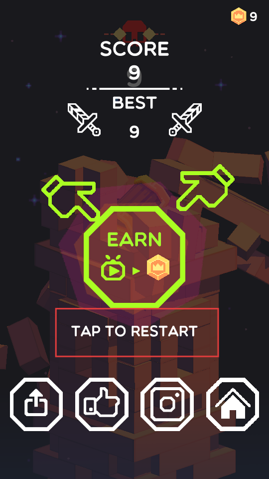 3、一局游戏结束后,你可以查看本局得分以及历史最佳成绩,点击“TAP TO RESTART”按钮就能重新发起挑战,游戏过程中积累的金币可用于后续的道具升级操作。