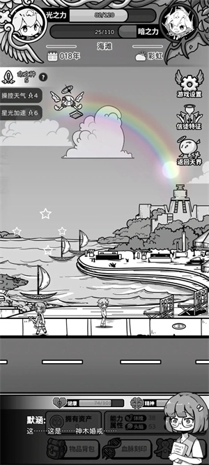 在玩法机制方面,这款游戏和传统的重开模拟类游戏相比,策略性要高出不少。玩家每一次主动对角色的人生选择进行干预,都得消耗光之力。游戏里还存在对应的暗之力,当暗之力积累到满值时就会触发审批环节,这有点像Boss战,要是挑战失败,角色就会被附加各种负面状态。审批的战斗采用回合制,玩家需要打出特定的卡牌来抵消对方施加的负面效果,但卡牌的抽取和使用过程是完全随机的。
