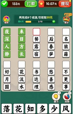 3、玩家可随时启用提示功能,以此直接获取答案;同时也能使用消除功能,让成语自动填充完成。