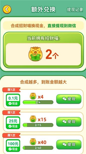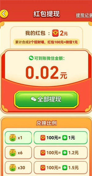 1、玩家一开始的兑换比例为1%,后面合成6个招财猫可以到1.2%,这样就能提现更多的红包,并且合成难度也不会太大。
