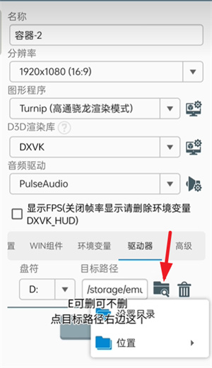 3、接着找到下方的驱动器,E盘可删除也可不删除,点击D路径右侧的这个按钮,选择设置目录。