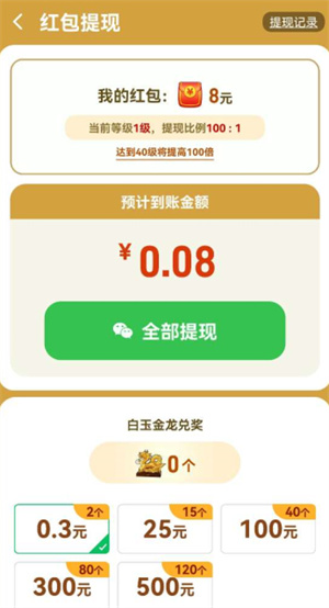 4、红包按照百分比,最低0.3即可提现。