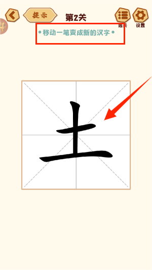 2、仔细观察屏幕中央显示的汉字结构后,用手指将其中任意一笔画拖动到新的位置。当横笔向上移动后使原汉字变成“工”字时,就完成了这次字形改造。