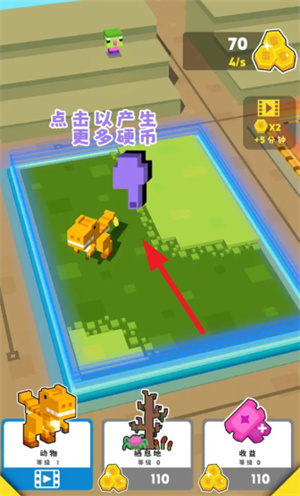进入动物园后,玩家可以持续投喂各类恐龙,以此快速获取金币。