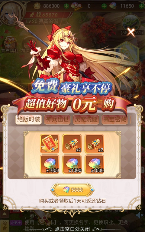 萌新专属补给福利来啦!首次充值即可享受五倍钻石返利,更有SSR女武神免费赠送,这个超值机会可是仅此一次,错过就没有啦!