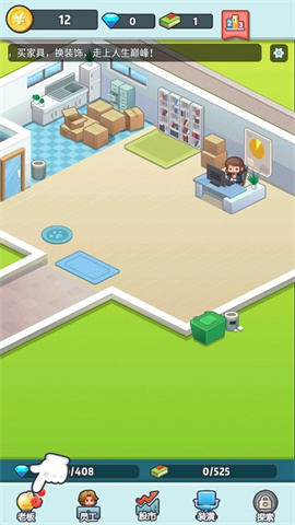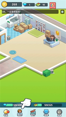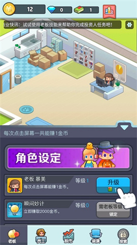 1、作为公司的老板,首先要培养的是赚钱的能力。借助游戏简单易操作的特点,玩家能够通过快速点击屏幕来获得收益。