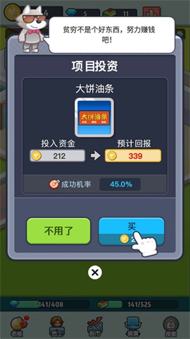 6、部分员工会提出投资项目,玩家要根据项目成功率的高低,来判断是否开展该投资计划。