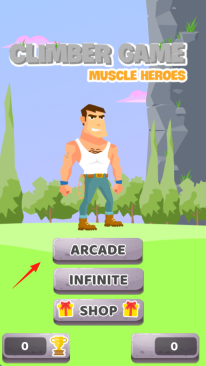 1在游戏的模式选择主界面,可挑选街机或无限模式开启挑战,也能进入商店选购道具,之后操控肌肉男角色踏上攀岩之旅。
