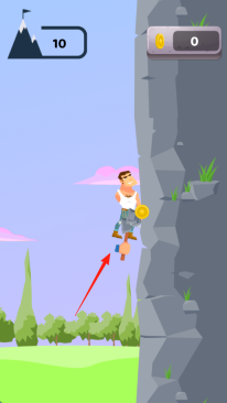 2、攀岩操作的场景设定在岩壁上,玩家点击屏幕即可让角色挥动斧头抓住岩点,从而向上攀爬并收集金币。界面会显示“10→11”的关卡进度,过程中需要注意躲避障碍。