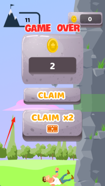 3、结算机制触发“GAMEOVER”后,界面会显示获得2金币,此时可选择“CLAIM(领取)”金币,或观看广告以“CLAIMx2(双倍领取)”金币,之后可重新挑战攀岩。