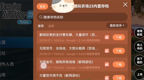 模拟农场23存档版,拥有存档功能的最新版,玩家一旦使用了这个功能,那么所有的车子就能直接解锁,这样玩家就能驾驶车子快速种植作物,也能运输货物,全看玩家自己的选择,每天都能得到超多的收益,分分钟可以让农场扩张。