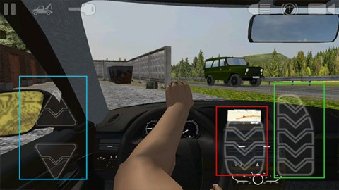 7车辆启动需点击界面左上角的钥匙图标,操作时蓝色按键用于切换挡位,红色按键负责制动,绿色按键控制加速;通过倾斜手机可调整行驶方向,初始视角为第一人称,若需切换至第三人称视角,点击界面右上角即可实现。