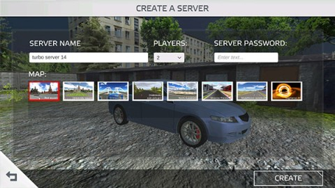 5依次完成以下操作:填写房间名称,设置进入密码与人数上限(最多32人),选定游戏地图后,点击CREATE按钮完成房间创建。
