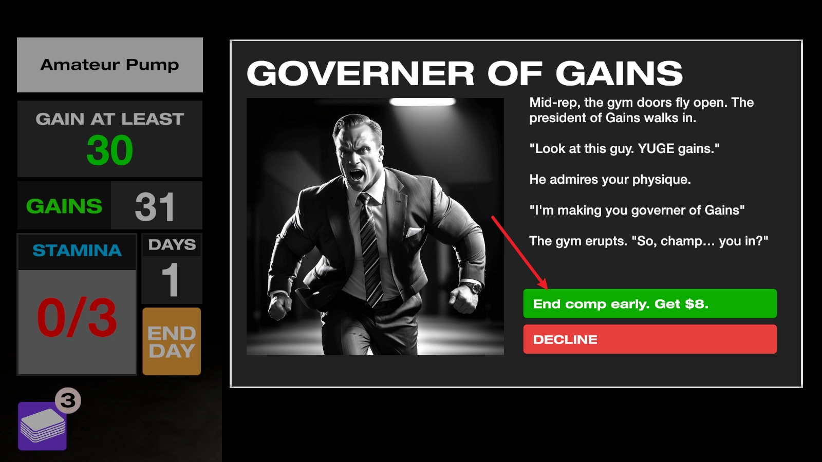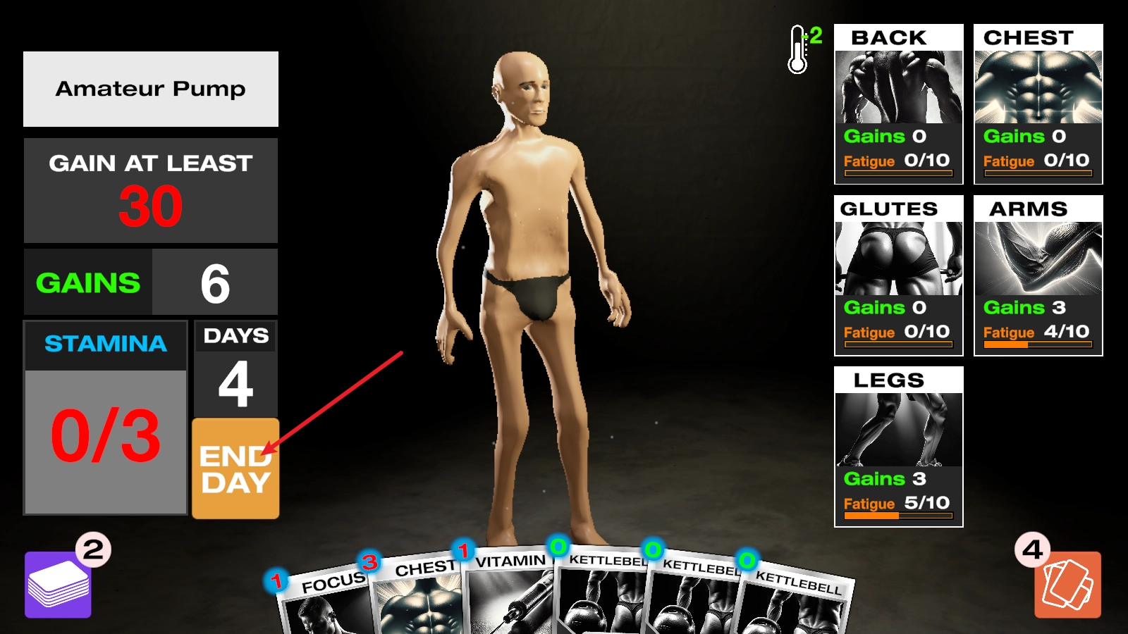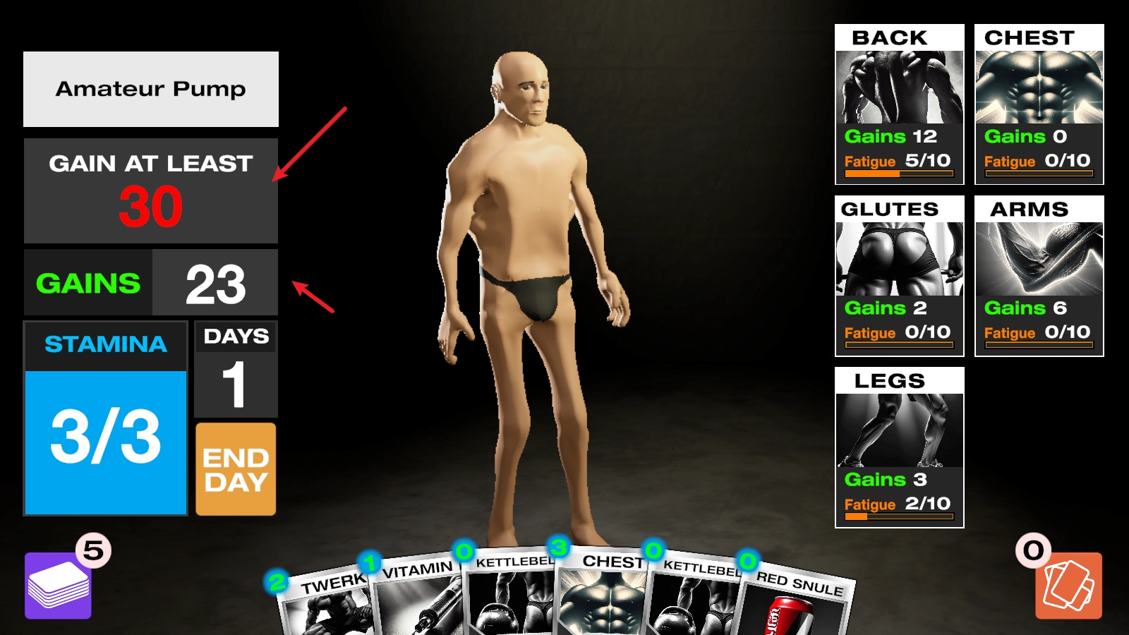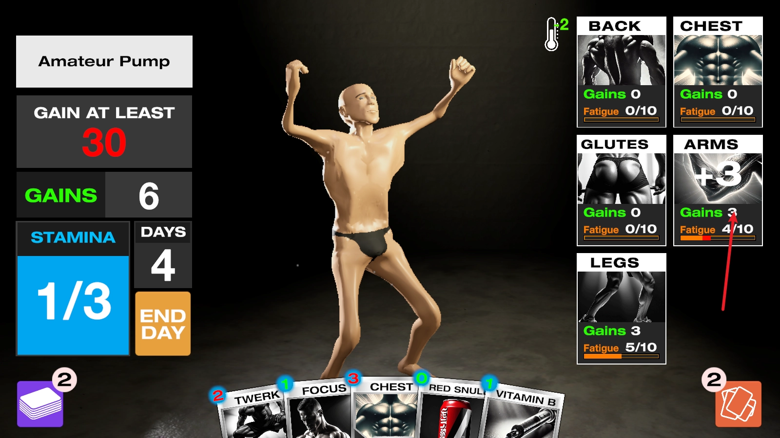 进入后,我们以打出卡牌的形式开展健身训练,每张卡牌都会消耗左侧对应的能量值。