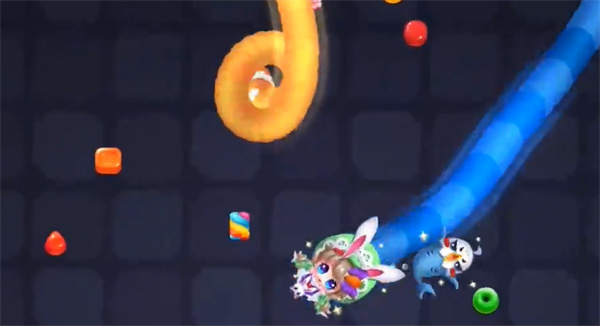 2、当你的蛇身长度足够长时,就能在地图里上演“以大欺小”的戏码啦。你可以把其他小蛇圈进自己的身体围成的区域内,等它们自己撞上来死掉,就能轻松拿到击杀数和糖果奖励!