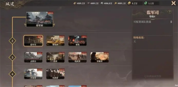 8、建筑优先级(分阶段):前期阶段,优先建造征兵所(用于保障预备兵的供应),其次是兵营(助力提升兵种等阶),最后为民居(主要产出铜币);进入后期阶段后,则优先考虑演武所(可增加带兵上限),接着是户籍所(负责征兵令的产出),最后是校场(提升募兵上限)。