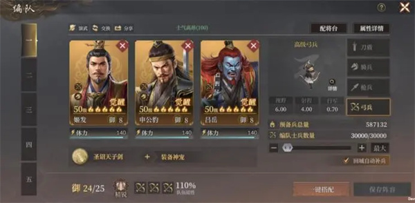 5、兵种克制规则:弓兵克制枪兵,枪兵克制骑兵,骑兵克制弓兵;盾兵防御能力出色,器械擅长攻城,二者独立于上述循环克制体系之外。此外,若上阵三名同兵种武将,可激活全队属性加成效果。