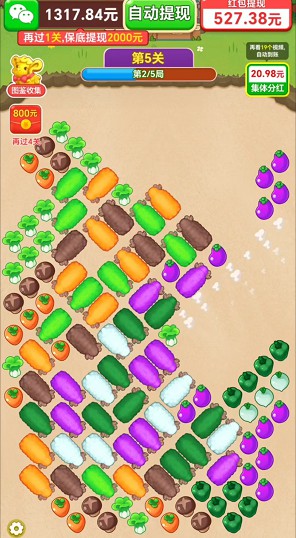 在小小羊村这个趣味关卡里,采用的是类似挪车闯关的玩法,不过这次需要移动的是萌萌的小羊。玩家要通过挪动小羊,让它们吃掉对应颜色的蔬菜,然后成功将小羊移走,这样就能直接通关。而且每次通关都能获得丰厚的红包奖励,前期关卡设计得比较简单,玩家不用花费太多时间就能轻松通过。