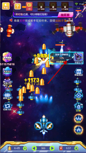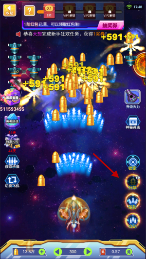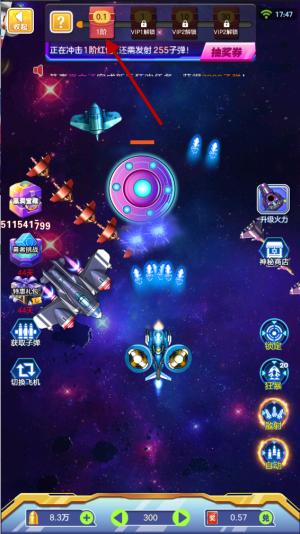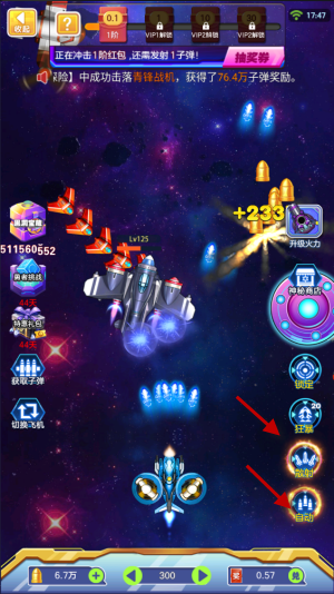 1、游戏中只需点击飞机就可以发射子弹,也可以点击下面的自动和散射,可以挂机发射。