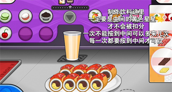 8、制作饮料这一步,必须按到中间的黄色星星才不会被扣分,要是一次没按准可以多尝试几次,每次操作都得精准按到中间才行。