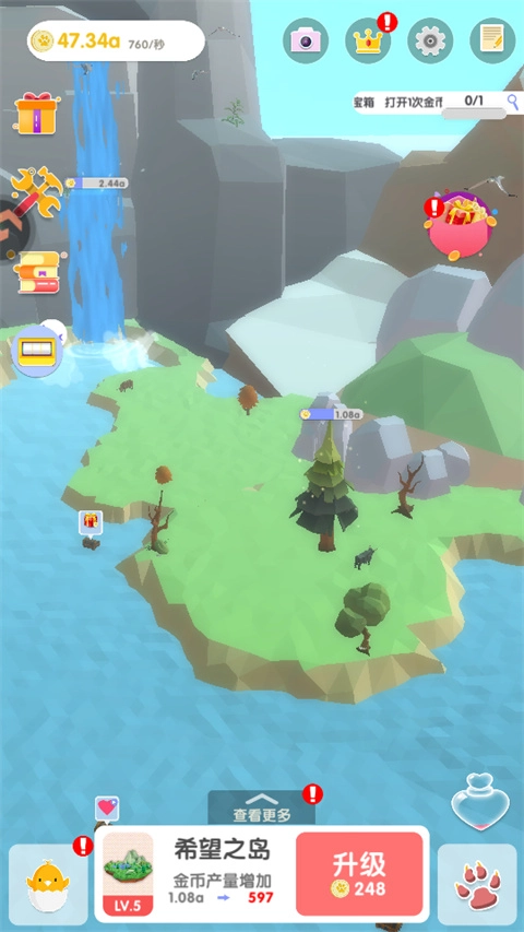 1.玩家在最初的时候,按照指引建造了一片空旷的海洋。同时居住地会产生金币,可以用来提升土地等级和金币产量。