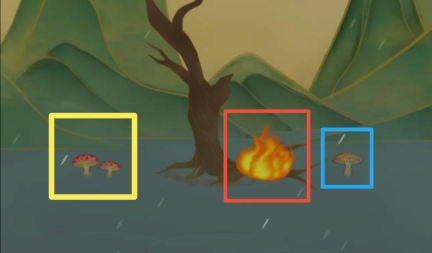 接下来出现的状况是,需要先稍作等待,之后会有火情发生。此时要点击处于蓝色区域的菌类,将其移动到红色区域进行烤制,完成后再递给木兰食用。