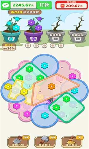 1、游戏里的各类道具作用各异,像有的能增加孔位,有的可清空孔位,还有的甚至能敲碎板子。