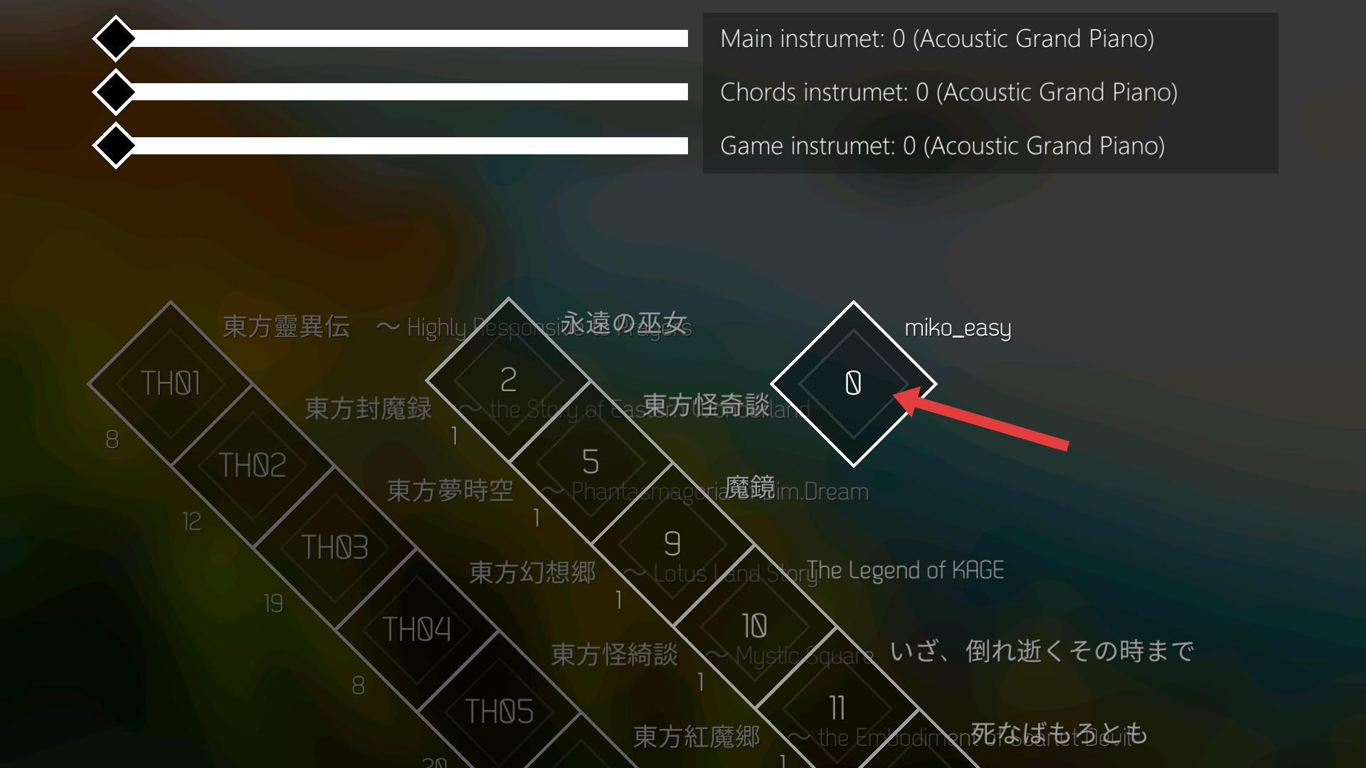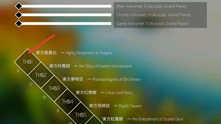 1、界面陈列多首东方系列音乐,用户可挑选喜爱的曲目,界面上方支持设置主乐器、和弦乐器与游戏乐器,完成选择后便能开启音乐游玩环节。