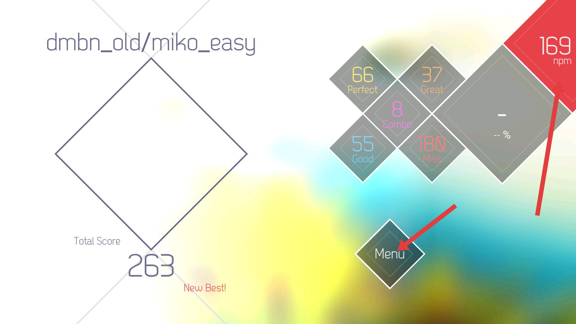 4、演奏结束后,界面会呈现得分以及Perfect、Great这类评价;要是想回到菜单,只需点击Menu按钮,就能挑选其他曲目或者调整相关设置。