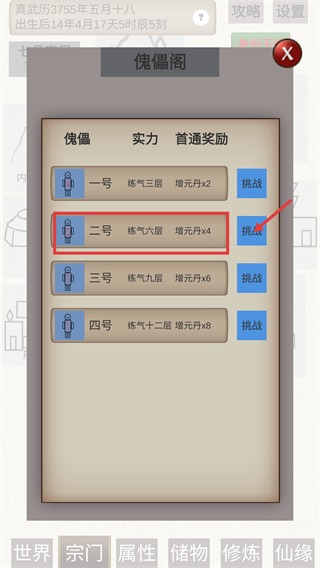 2、进入【傀儡阁】界面后,建议优先挑战【傀儡二号】,它的实力为【炼气六层】,比较适合初期阶段,通关之后能得到【海元丹×4】,有助于积累资源。
