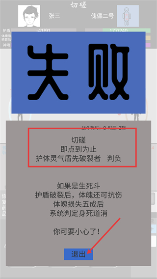 4、要是【切磋】没能成功,得记住【护体灵气先被击破的一方判定为失败】的规则,点击【退出】后去提升护体属性,然后再试着发起挑战。
