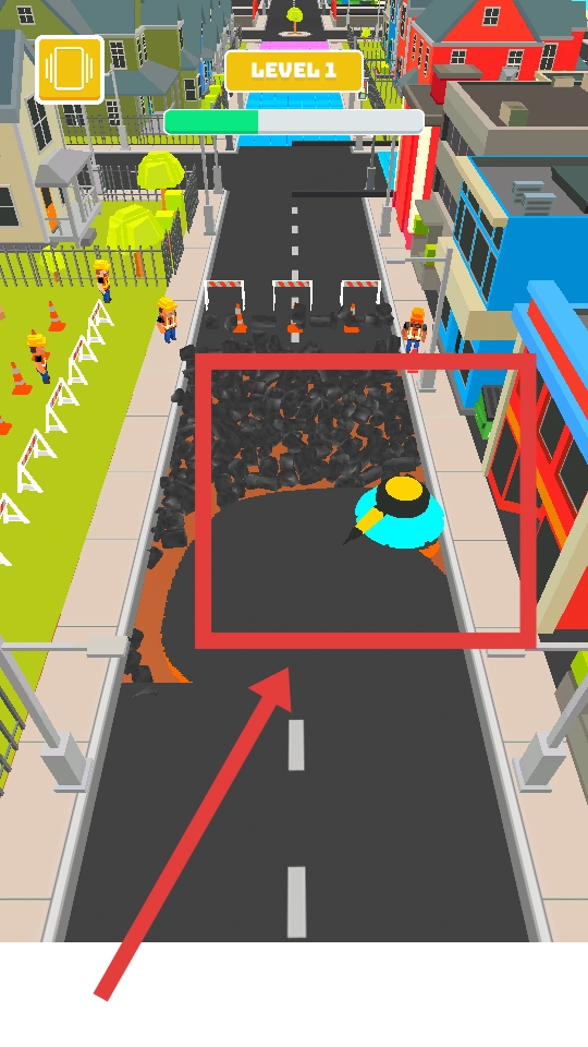 进入第一关界面,能看到道路上有黑色的碎石堆,需要操控铲车清理这些碎石,以此推进道路修缮的进程。