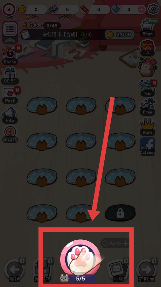进入游戏后,在界面下方找到那个粉色爪印形状的按钮,点击它就能获取新猫咪,这是后续进行合成操作的基础。