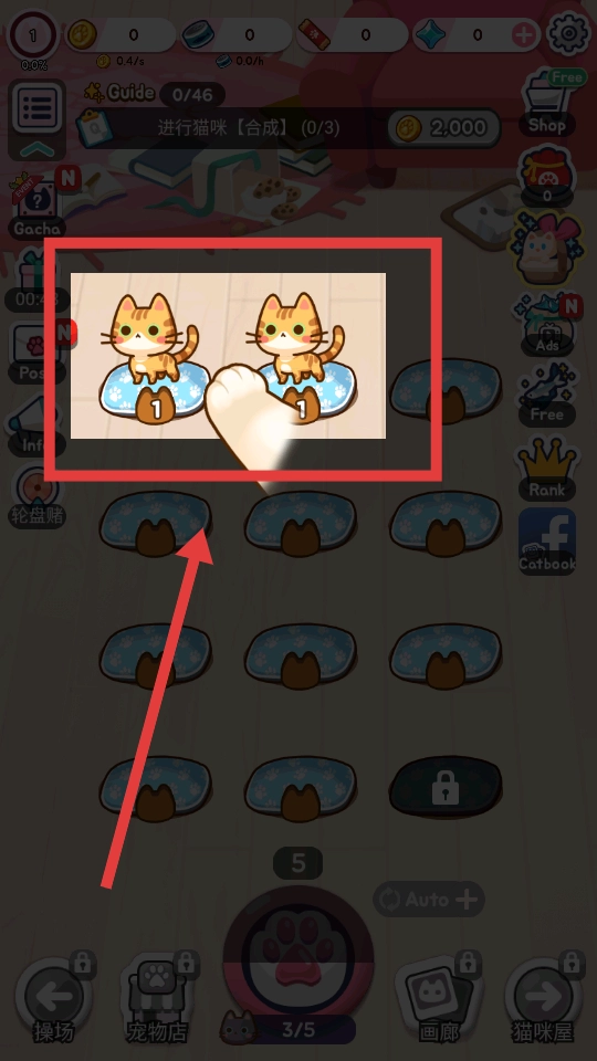 根据游戏指引,把等级相同的猫咪进行合并,操作方式是拖拽,将两只一样的猫咪放到一块儿,就能完成合成升级啦。