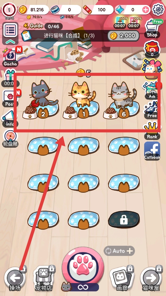 合成后的猫咪会自动安置到空猫窝里,等猫咪等级提高了,就能给你带来更多金币收益,帮你推进游戏进度。