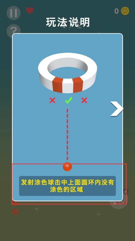 仔细观察圆环,找到那些还没被涂色的区域,调整好发射的角度,然后点击屏幕发射涂色球。只要击中对应的区域,就能给它涂上颜色,可千万别打错地方哦。