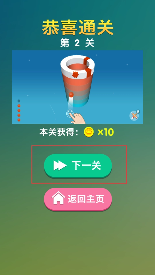 每通过一个关卡,就能得到金币奖励。你可以点击下一关按钮开启新的挑战,也可以返回主页,重新挑选关卡来玩。