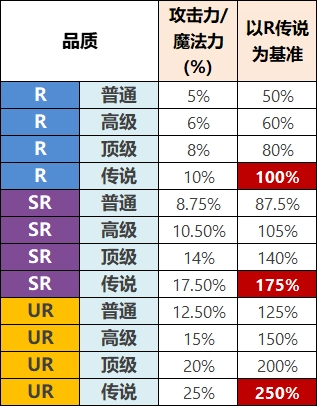 7、通常会把普通、高级、顶级、传说这几个品质简称为1234,UR传说则简称UR4;魔兽装备的品质等同于制作出的【顶级】品质装备,但它必定能炼制成SSS。普通和高级品质的装备属性较差,强化时消耗的资源还多,所以基本上大家都会选择用顶级或传说品质的装备;专武的数值和对应等级的传说品质装备是一样的;魔兽装备的数值和对应等级的顶级品质装备相同,而SSS品质的魔兽装备差不多相当于属性评分为bba(15分)的对应等级传说装备,这是因为专武比它们多一个词条。具体来说:5星角色的SR专武和UR传说品质装备的水平相当;UR传说品质装备优于4星角色的SR专武,而4星角色的SR专武又比UR顶级品质装备要好;3星角色的SR专武则和UR顶级品质装备的水平一样(这里的比较都把专武自带的专属词条算进去了)。另外,辅助和坦克角色对装备的要求不算高,随便带一些加抗性的装备就行,饰品则选择加血量的。