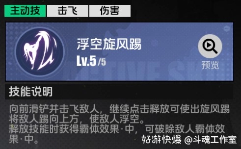 跃起膝撞能让周围敌人浮空,再次释放该技能可将敌人砸向地面。这是一个具备突进特性的高倍率伤害技能。