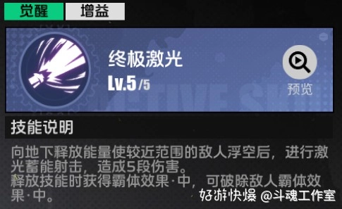 经过短暂的能量积蓄后,会朝敌人释放激光,此激光带有眩晕效果;与此同时,还能将近距离的敌人击退,并对其造成额外伤害。该技能是核心的伤害输出手段,不仅覆盖范围大,还能进行超远距离的消耗,以此削减敌人的生命值。